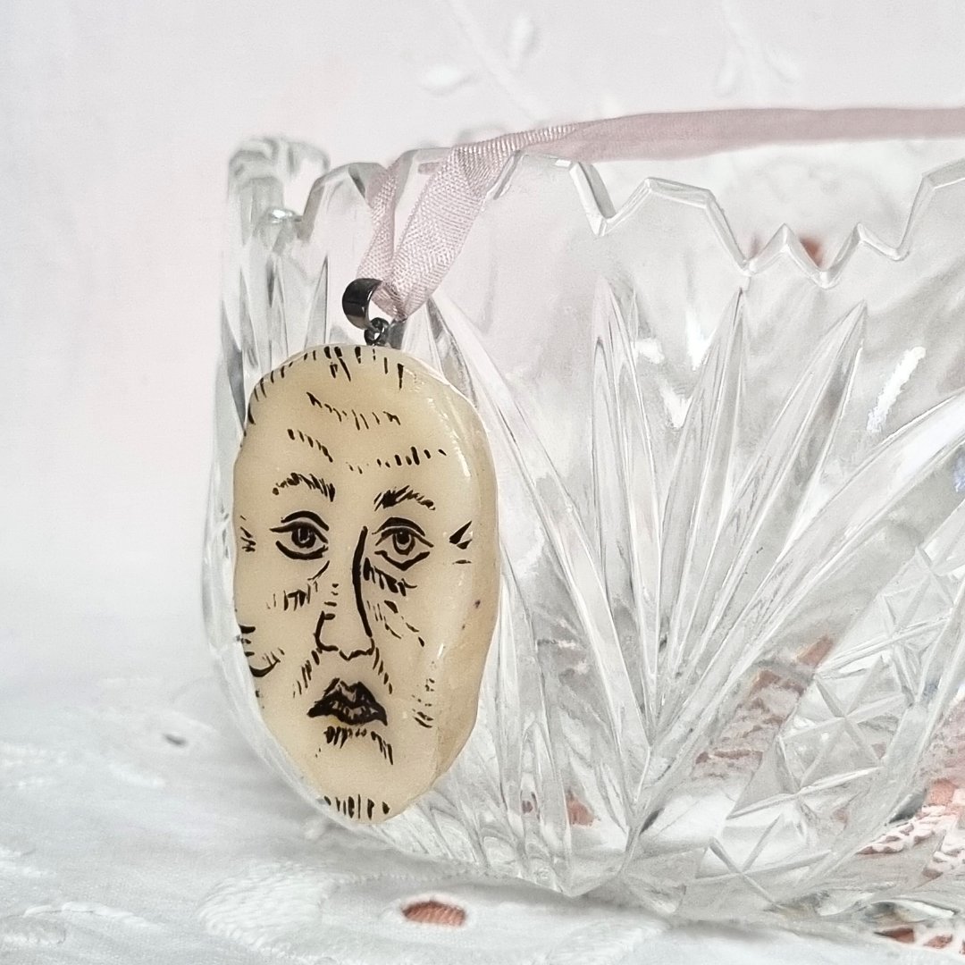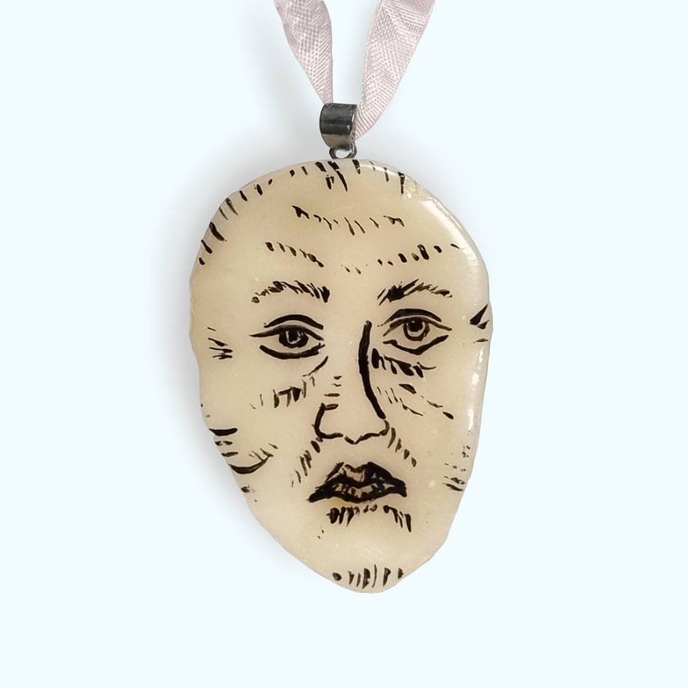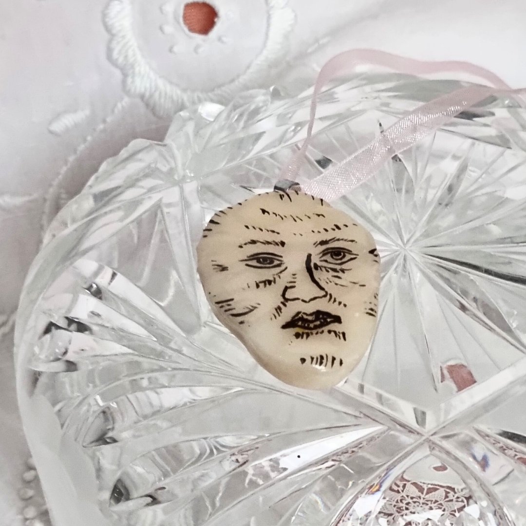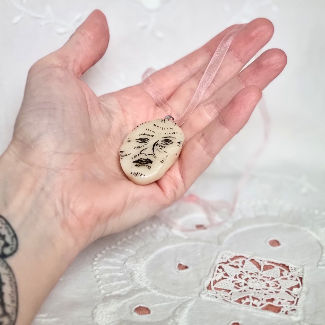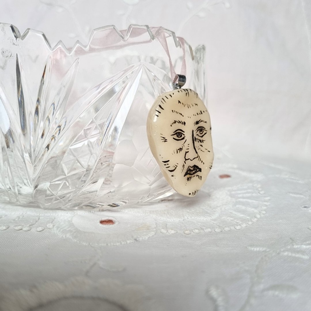 Smykket forestiller et ansigt i subtilt sort/hvidt, der fanger essensen af følelsesmæssig kompleksitet. Hvert træk er nøje skulptureret i hånden af Christine Reinwald, for at skabe en æstetisk og rørende, visuel oplevelse.