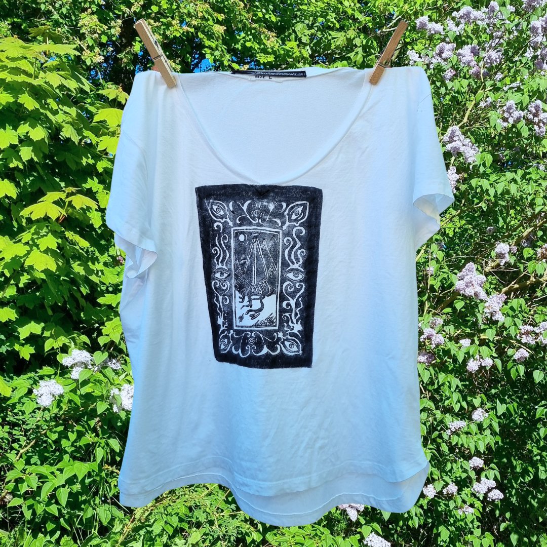 Space Udyssey tshirtsne er unikaer, da de er trykt i hånden med brug af linoleumssnit. Der er brugt samme trykplade som til mine populære linoleumsprints med samme motiv på syrefrit papir, som der nu kun er få tilbage af på lager.