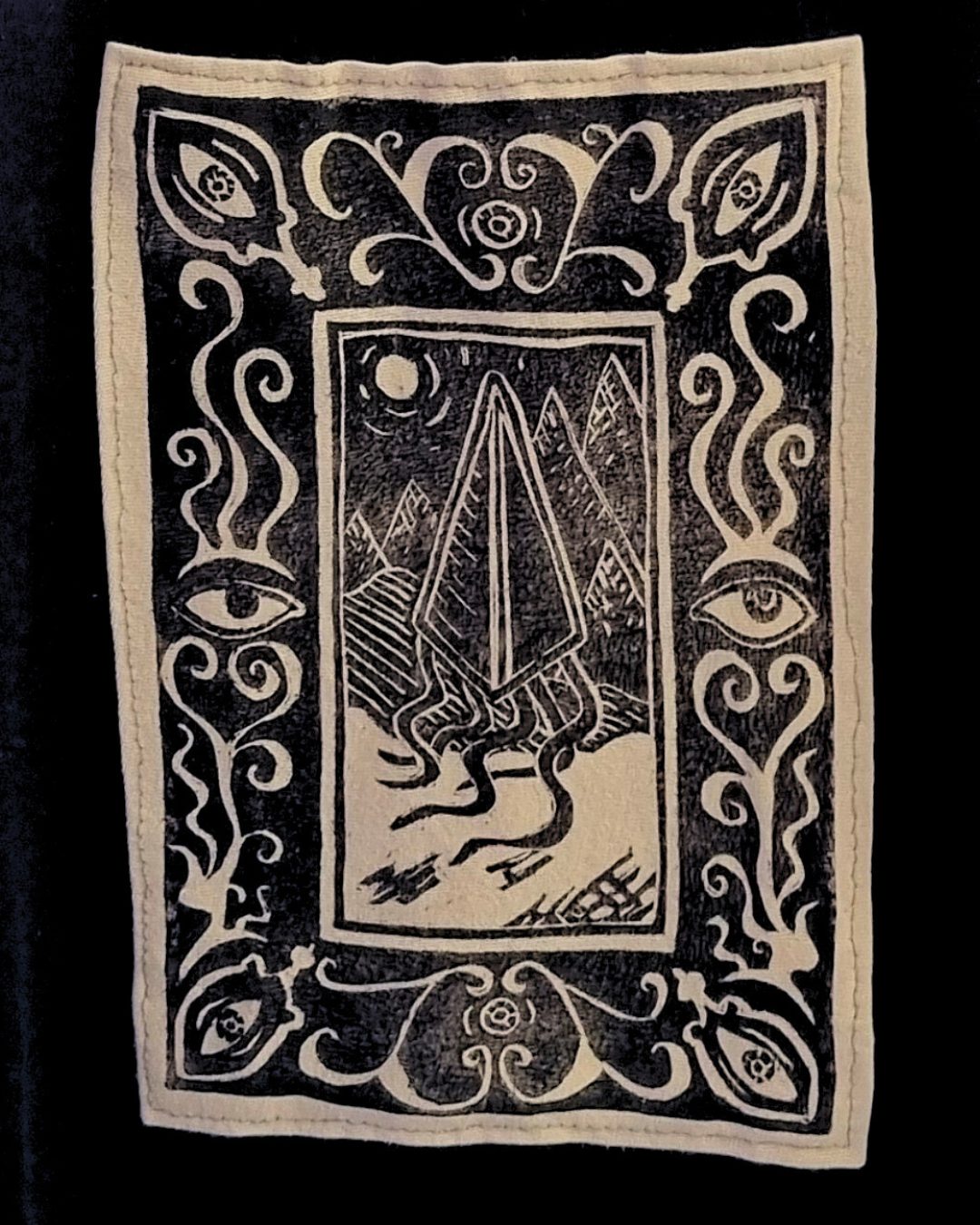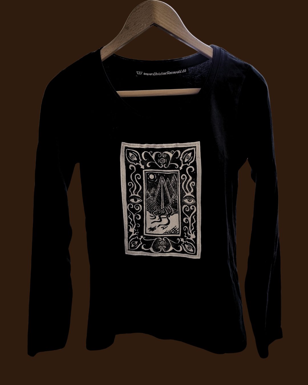Space Udyssey tshirtsne er unikaer, da de er trykt i hånden med brug af linoleumssnit. Disse langærmede tshirts har applikeret tryk på, som er håndsyet på.