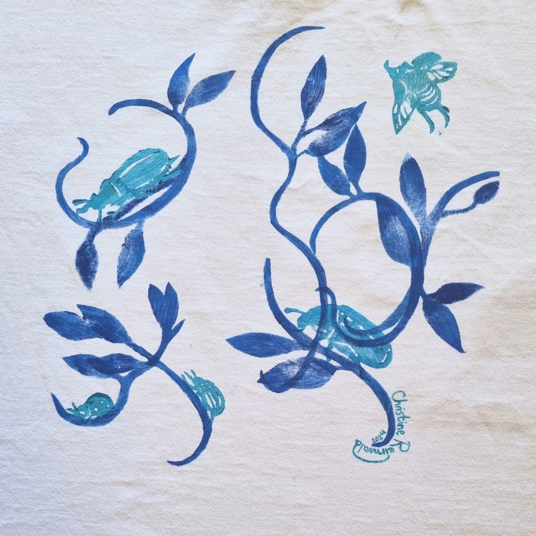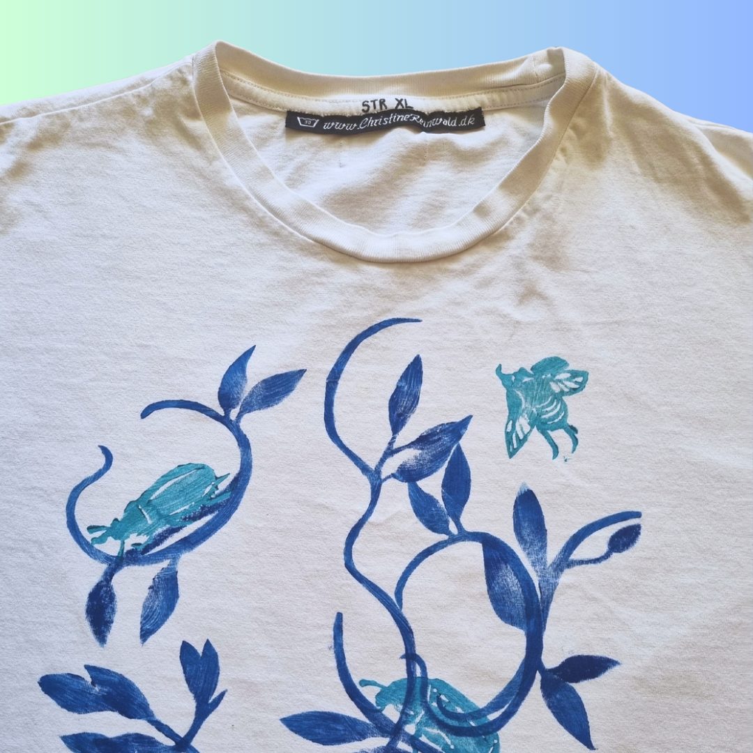 Tshirt med tryk. Håndtrykt motiv af vildnis med guldbasse, gåsebille, næsehornsbille, mariehøne og coloradobiller på genbrugstshirt i 100% bomuld.